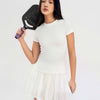 Bộ đồ được hoàn thiện với chiếc váy xếp ly, thiết kế với quần short liền trong để đảm bảo tính năng động và thoải mái.