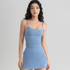 Áo bra có thiết kế dây mảnh cùng cổ vuông sâu, tôn lên vùng xương quai xanh quyến rũ. Chiều dài ngang hông kết hợp với chi tiết nhún nhẹ hai bên hông giúp tôn dáng và tạo hiệu ứng vòng eo thon gọn. Đi kèm là chân váy chữ A với quần short liền bên trong và túi bên hông tiện lợi.